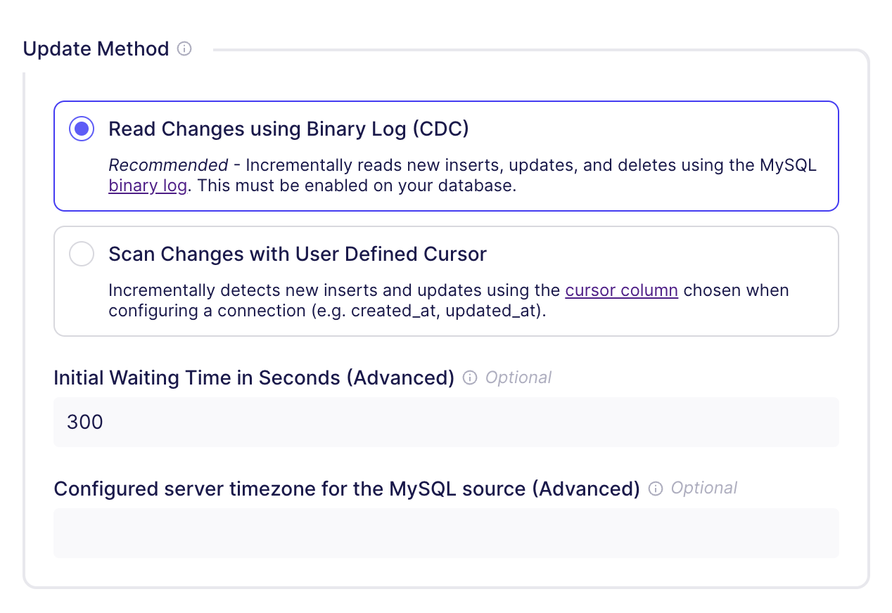 "description": "<i>Recommended</i> - Incrementally reads new inserts, updates, and deletes using the MySQL <a href=\"https://docs.airbyte.com/integrations/sources/mysql/#change-data-capture-cdc\">binary log</a>. This must be enabled on your database.",